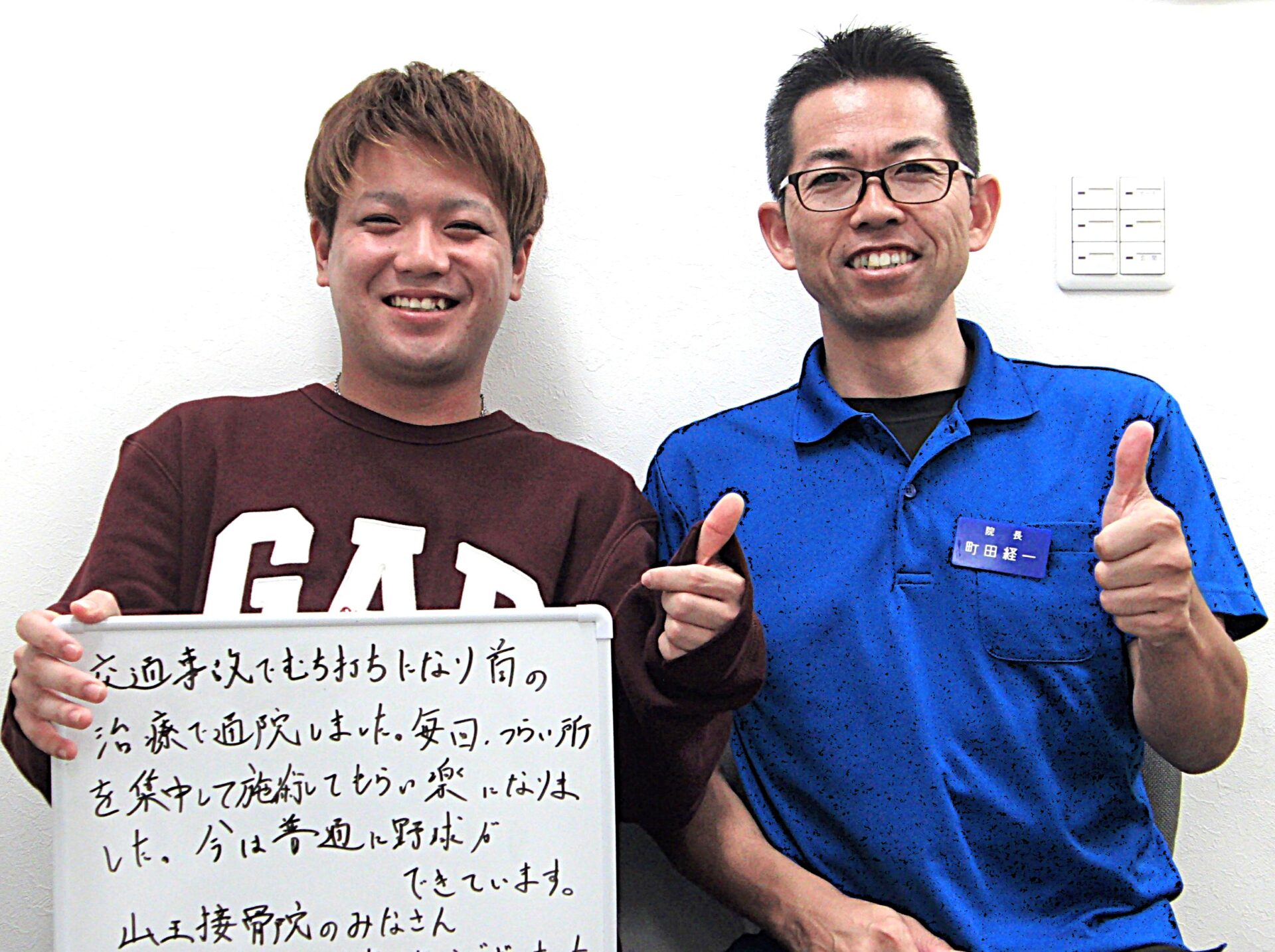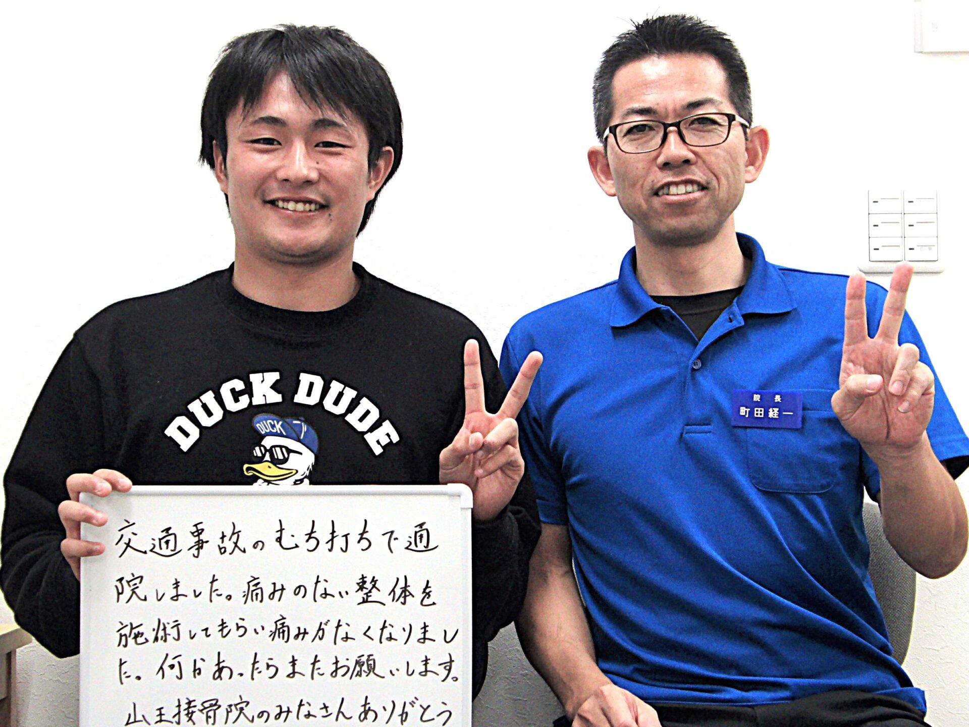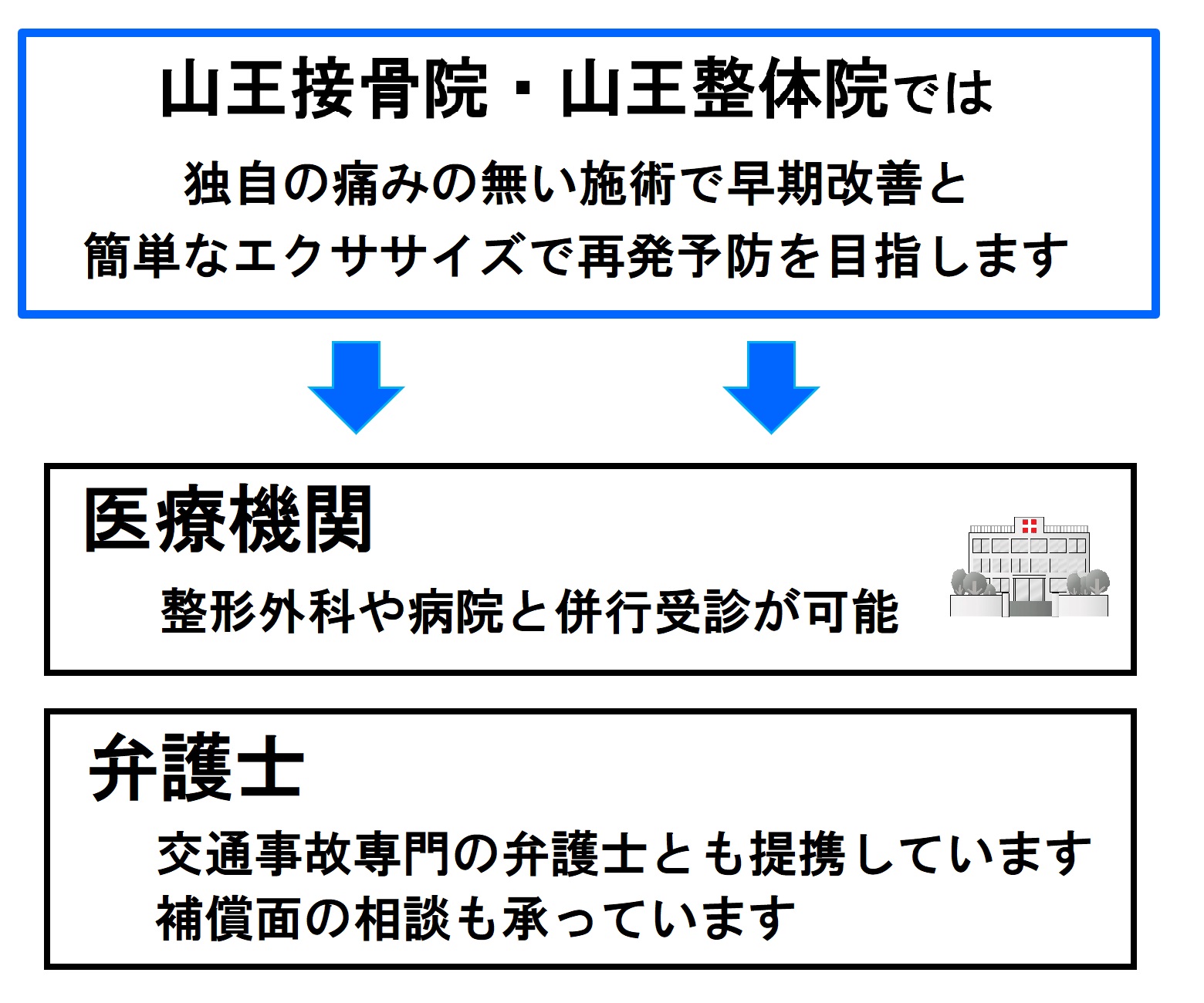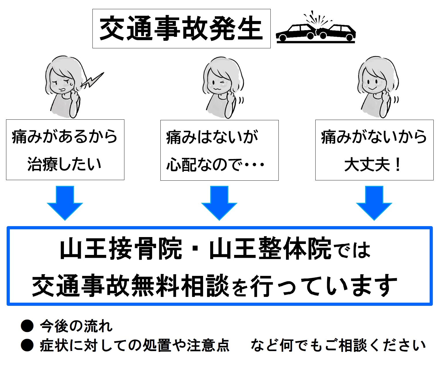 交通事故・むち打ち治療なら山王接骨院・山王整体院(前橋市)へ 交通事故にあわれて辛い思いをしていませんか? ◆ むち打ち(頸椎捻挫)になり痛みで思うように動けない◆ 首や肩の痛み・動作制限がある◆ 腰痛・背部痛があり辛い◆ 手や足にしびれがあり薬に頼っている◆ 症状が残らないようにしっかり治療したい どんなに注意していても事故は突然起こります。事故によるケガは、思った以上に体に力が加わっているので日常生活の大きな影響を与えます。 交通事故後の首・腰の痛みやしびれでお困りではありませんか? むち打ち症は、事故直後は軽い違和感でも、数日後に強い痛みや頭痛・めまい・しびれとして現れることがあります。放置すると慢性化や後遺症につながるため、早期の専門治療がとても重要です。山王接骨院・山王整体院(群馬県前橋市)では、自賠責保険が適用される交通事故治療に対応し、患者さまの症状改善と早期回復を全力でサポートしています。 むち打ち症の種類 追突や衝突などの事故の瞬間、首がムチのようにしなって起こる症状の事を「むち打ち症」と言います。「むち打ち症」は正式には、「頸椎捻挫」「頚部挫傷」「外傷性頚部症候群」などと呼ばれます。むち打ち症には次のような分類があります。 ● 頸椎捻挫型むち打ち症の約75%。骨に異常はないが筋肉や靭帯などが損傷して発症する。● 神経根症状型首から腕に伸びている神経がダメージを受けることで現れます。首や腕を動かすと痛みやしびれが強くなることがあります。● バレ・リーウー症候群衝撃で自律神経の働きが異常をきたす状態。受賞後にしっかり安静が保たれなかった場合に起こりやすいと言われています。● 脊髄症状型首の椎間板がヘルニアを起こしk脊髄を圧迫し発症します。首や腕、下半身にも症状が現れることが多いのが特徴です。● 脳脊髄減少症脳脊髄液が減少し、頭痛やめまい、耳鳴り、起きづらいなど様々な症状が現れます。特に気圧の変化で症状が悪化します。 まずは無理せず安静を心掛けてください 事故の直後は大したことがないと思っていても、気が高ぶっていて症状に気付かない場合や、数日経ってから症状が出てくる場合もあります。通院の有無に関係なく、1週間くらいは安静に心掛けて無理をしないようにしてください。 交通事故後の通院の流れ 1. 事故直後:警察・保険会社に連絡し、整形外科を受診 2. 当院へ相談:症状の確認・施術方針をご説明 3. 施術開始:痛みの軽減+リハビリ・コンディショニング 4. 回復期:エクササイズや体幹ケアで再発予防 当院が選ばれる理由 1. 痛みの少ない安心施術 – 無理に動かさず、症状に合わせたやさしい手技2. 最新治療器「マトリクスウェーブ」導入 – 筋肉・神経の回復を促進3. 交通事故治療の豊富な実績 – 多くの患者さまの改善例あり4. 自賠責保険に対応 – 保険適用で自己負担0円での通院も可能5. アクセス便利 – 前橋市を中心に伊勢崎市・玉村町・高崎市からも来院多数 交通事故の無料相談を行っています 無料相談にお越しいただき、今後の注意するべき事や事故後の流れなどをお伝えいたします。交通事故によるむち打ち症や打撲、捻挫などの交通事故対応は、接骨院でも可能です。病院や整形外科の通院と並行して通うことができるので、何が最善なのかを仕事や生活の状況に合わせてご提案させていただきます。加害者でも、自損事故でも事故の治療はできます! ▶ 過失割合が未確定▶ 加害者▶ 自損(自爆)事故▶ 労災・通勤災害どんな時でも交通事故の治療は可能です。 当院の施術は痛みの無い範囲で行うので安心! 事故の衝撃は、思った以上に体にダメージを与えています。そのため、その日その日のコンディションや天候により症状が変化することも少なくありません。山王接骨院・山王整体院では、負傷した部分はもちろん、その日の状況、状態により何がどこに影響を与えているかを確認しながら施術しています。施術は、痛みを感じ無い範囲でやさしい手技を行っていきますのでご安心ください。 交通事故後に施術を受けた患者様の声 ▶ KKC様 34歳 男性 伊勢崎市在住▶ お悩みや来院理由交通事故による首から肩、肩甲骨周辺の痛みがあり、知人に紹介していただき伺いました。▶ 施術後の感想痛みのある箇所ごとに、その日の症状に合わせて治療をしていただきました。初めは施術を受けても2~3日で痛みが出てしまいましたが、1ヶ月を経過したころから痛みが出る頻度が改善されました。約2ヶ月経ち、今ではすっかり良くなりました。ありがとうございました。 ※個人の感想であり、効果を保証するものではありません 受付 9:00~20:00 休み:日・祝 当日のご予約はお電話で承ります よくある質問 Q1. 交通事故に遭った直後、まず何をすればいいですか?事故直後は体が興奮状態になり、痛みを感じにくいことがあります。そのため、以下の手順で早めの対応を行うことが大切です。警察への連絡(事故証明の取得)医療機関での